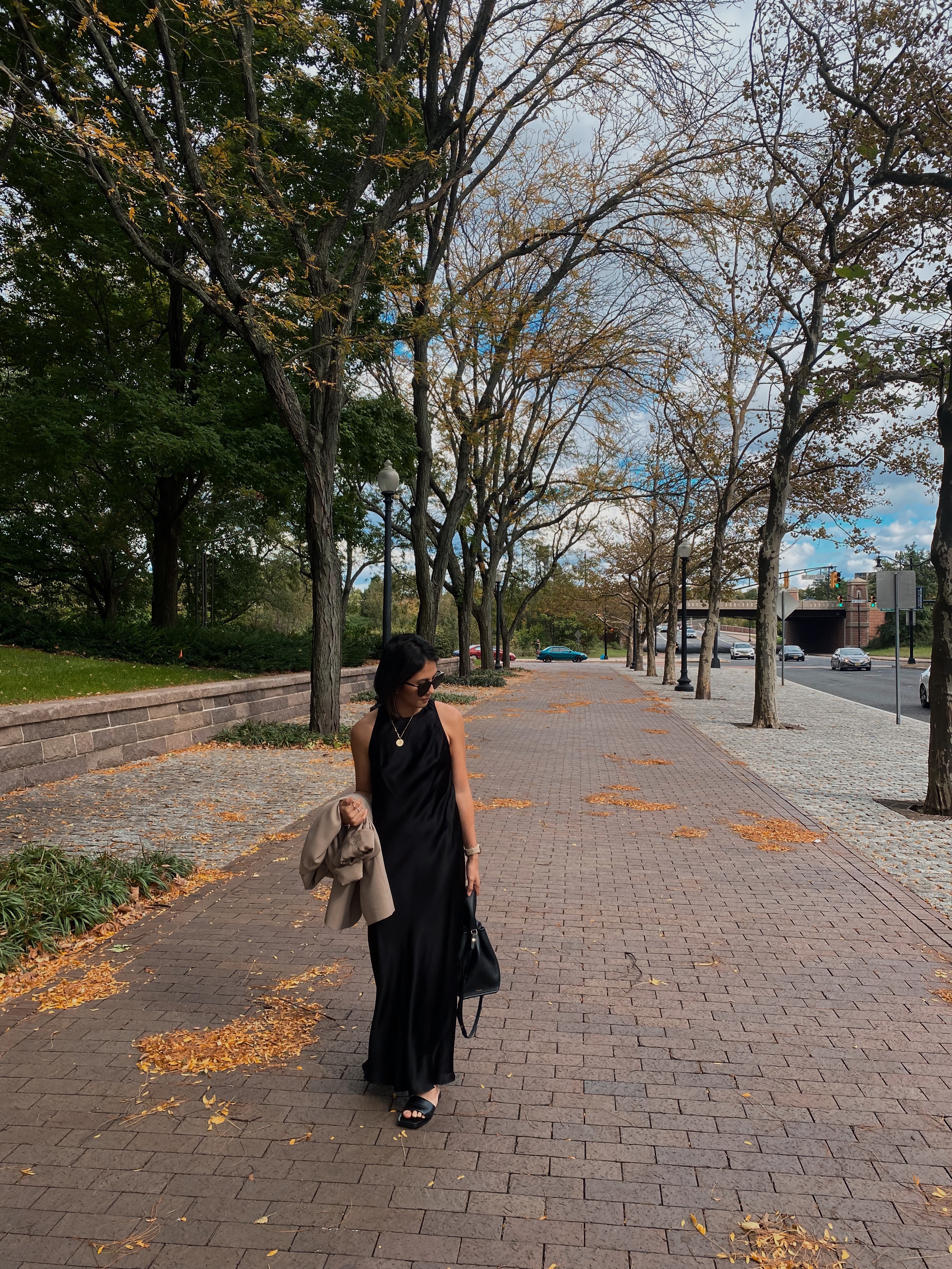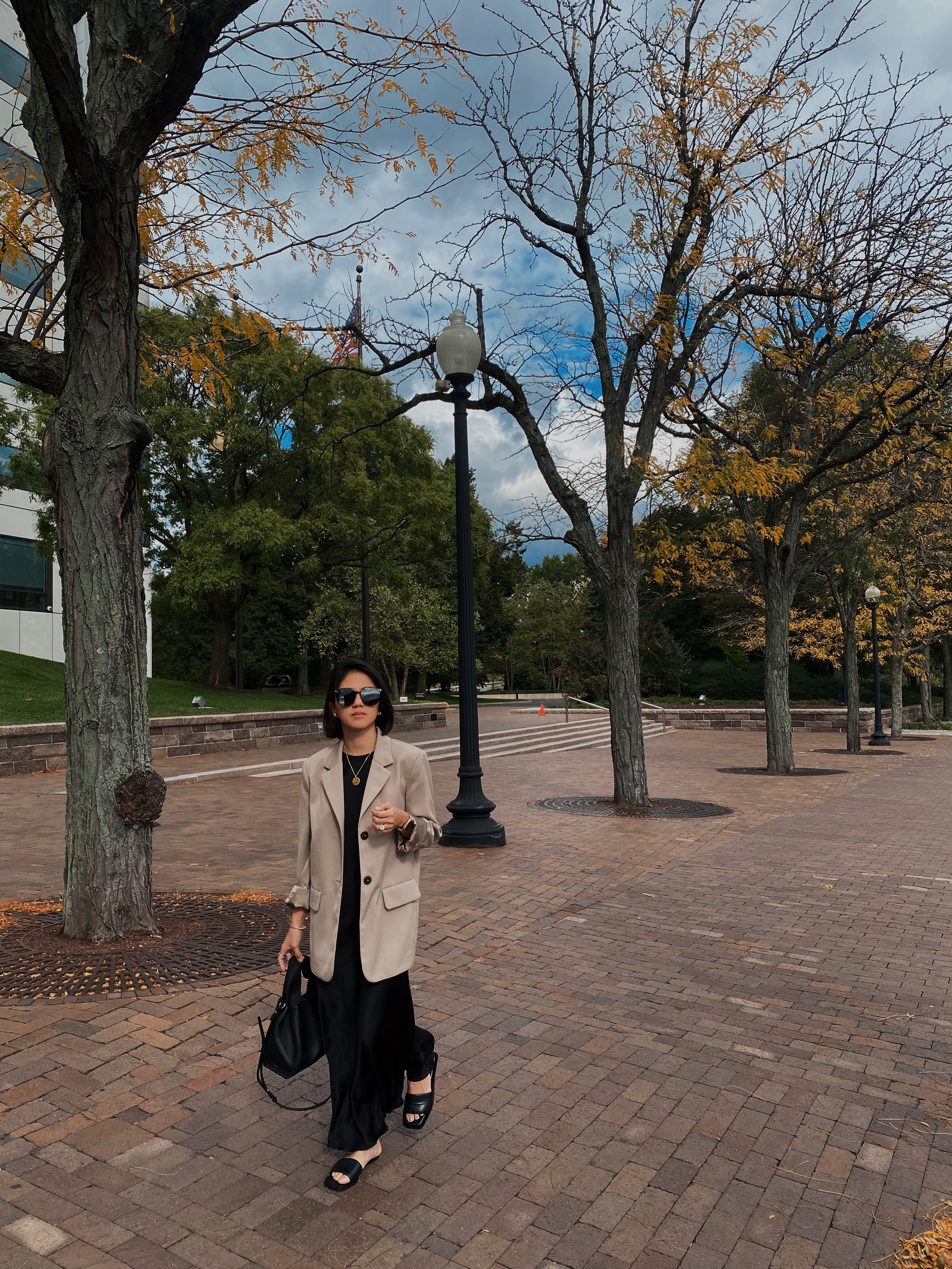 Black Dress | Tan Blazer | Black Sandals | Bag
